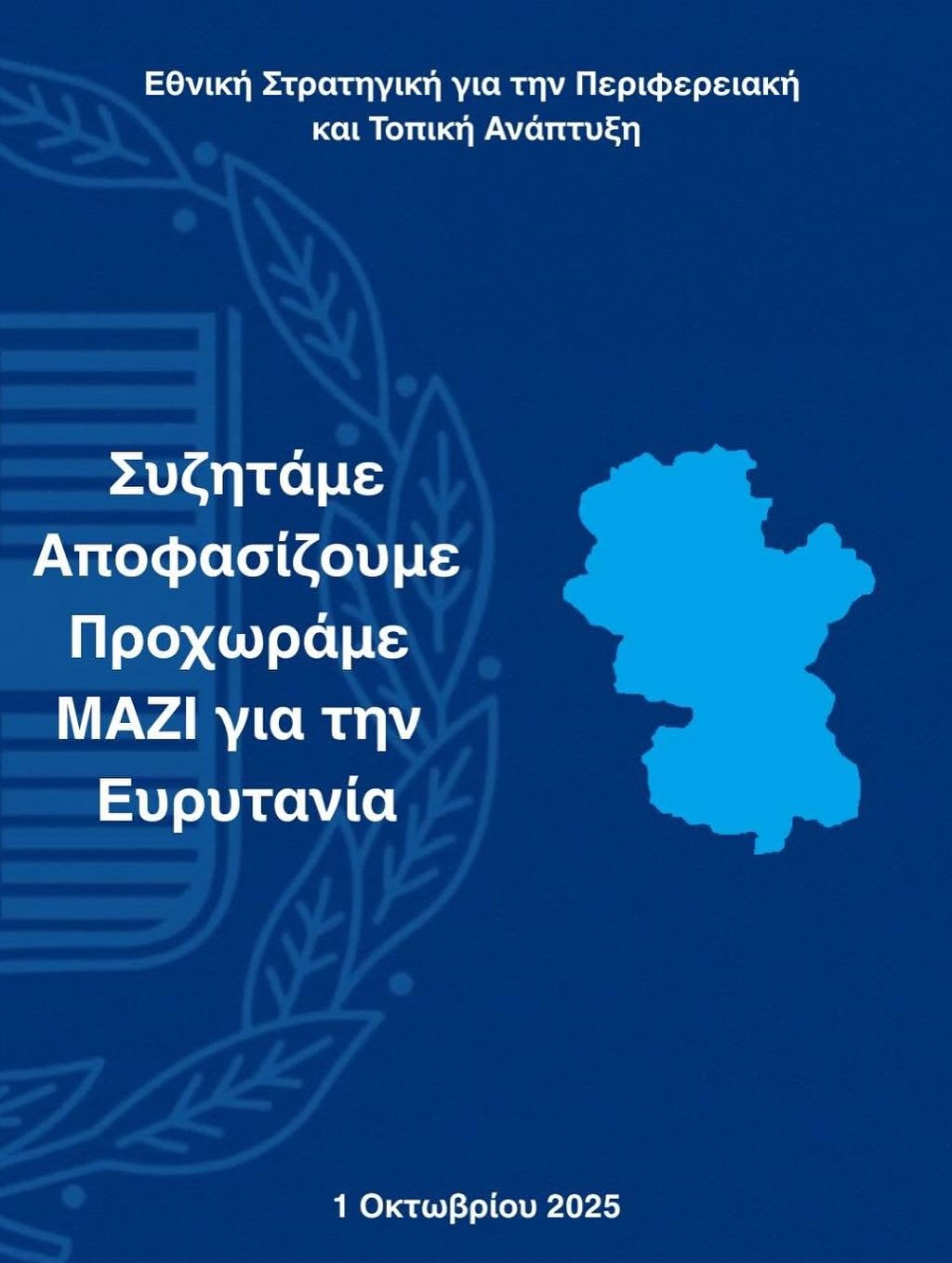 * Διευρυμένο κυβερνητικό κλιμάκιο, υπό τον Υφυπουργό παρά τω πρωθυπουργώ Θανάση Κοντογεώργη, παρουσίασε το Τοπικό Σχέδιο Ανάπτυξης της Ευρυτανίας, στα πλαίσια της ΕΘνικής Στρατηγικής για την Περιφερειακή και Τοπική Ανάπτυξη που εκπονεί η κυβέρνηση. https://erga.gov.gr/…/region_assets/tpa_euritania_2025.pdf
